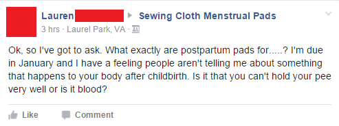 Buy disposable underwear for the first few days after birth. They will get VERY dirty. Or use your ratty old pairs that you’re ready to get rid of. Double up on pads – line them all the way up your ass-crack. I am so serious. And wear dark pants.